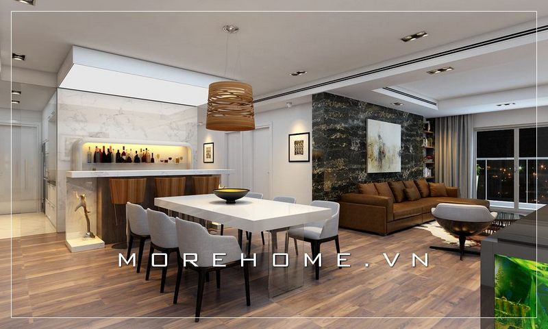 Thiết kế phòng ăn hiện đại với mẫu bàn ăn gỗ kết hợp mặt bàn đá sang trọng, ấm cúng