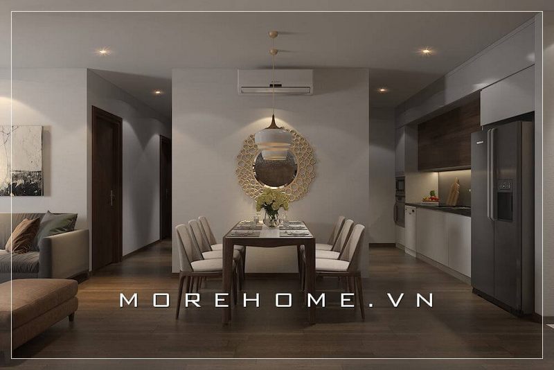 Mẫu bàn ăn gỗ được nơi bóng tạo sự phản chiếu ánh sáng cho phòng ăn, tạo hiệu ứng đẹp cho phòng ăn hiện đại