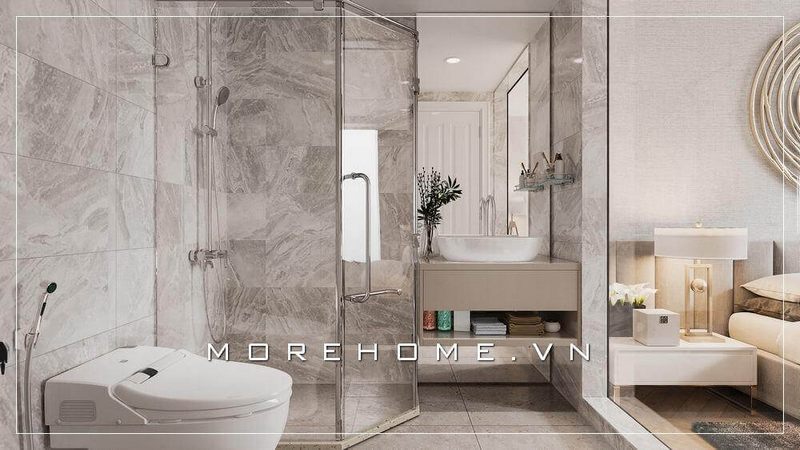 Lựa chọn gạch ốp tường và gạch lát nền phòng tắm màu trắng bóng giúp không gian thông thoáng và sang trọng hơn.