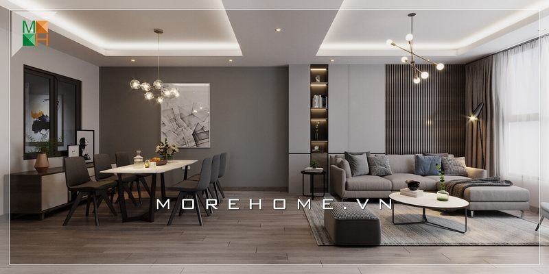 KTS MoreHome đã tạo ra một mẫu thiết kế phòng khách chung cư đẹp mắt với nội thất hiện đại tông màu trắng xám sang trọng và đẳng cấp.