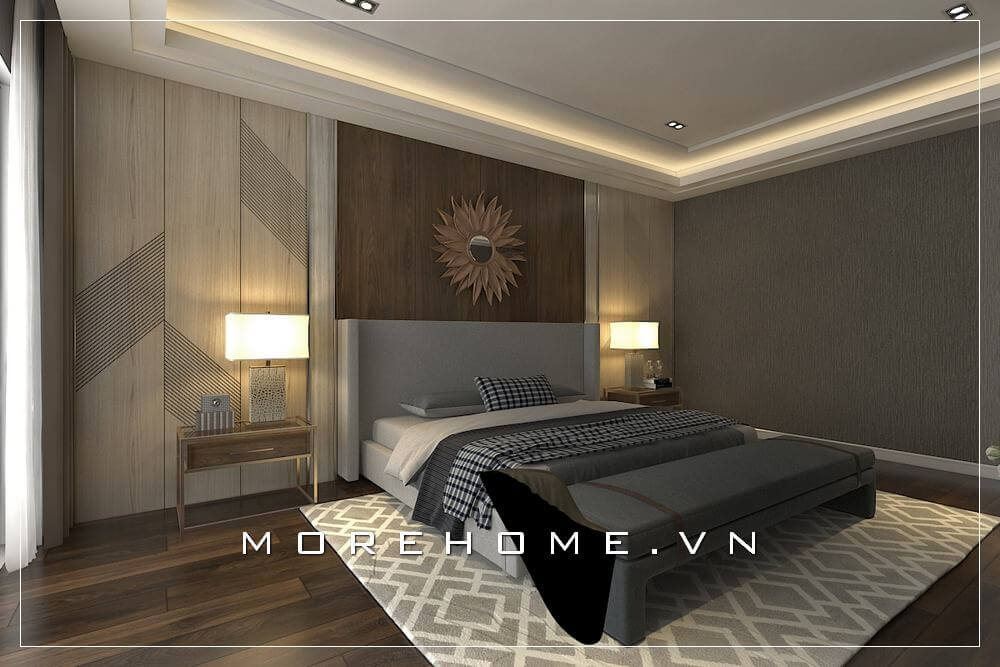 Phòng ngủ được thiết kế theo phong cách hiện đại, với tủ gỗ công nghiệp kịch trần cánh lùa vừa tiện lợi mà vẫn tiết kiệm không gian sử dụng, kết hợp giường ngủ gỗ công nghiệp bọc nệm nỉ đầu giường, tạo sự thoải mái cho bạn khi sinh hoạt và nghỉ ngơi